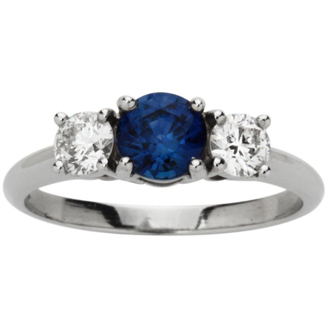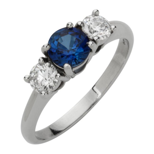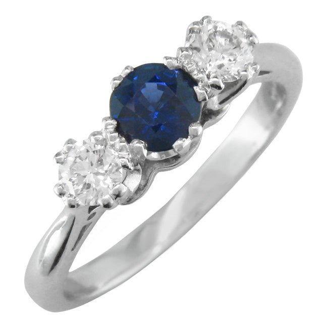 This ring features a round blue sapphire with a round diamond on either side.