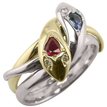 The entwined double snake ring is set with a pear-shaped sapphire and a pear-shaped ruby, each weighing 0.30 carat. Diamond eyes weighing 0.02 carat complete the ring.