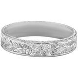 This unique 5mm flat court wedding ring in platinum is hand-engraved with the forget-me-not pattern. The hand applied millegrain (milgrain) edges complete the vintage style design.