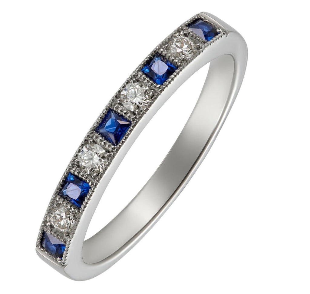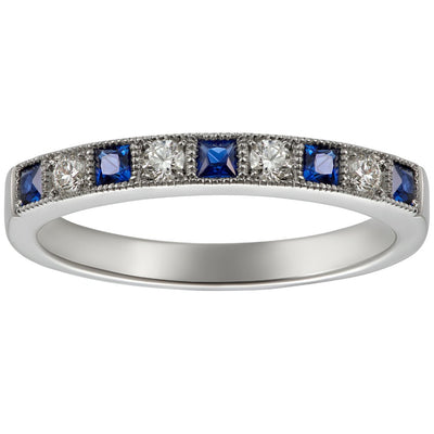 This diamond and sapphire wedding or eternity ring is set with princess cut blue sapphires and alternating round brilliant cut diamonds. The royal vivid blue sapphire and diamond band features a millegrain edge for a vintage-inspired finish.