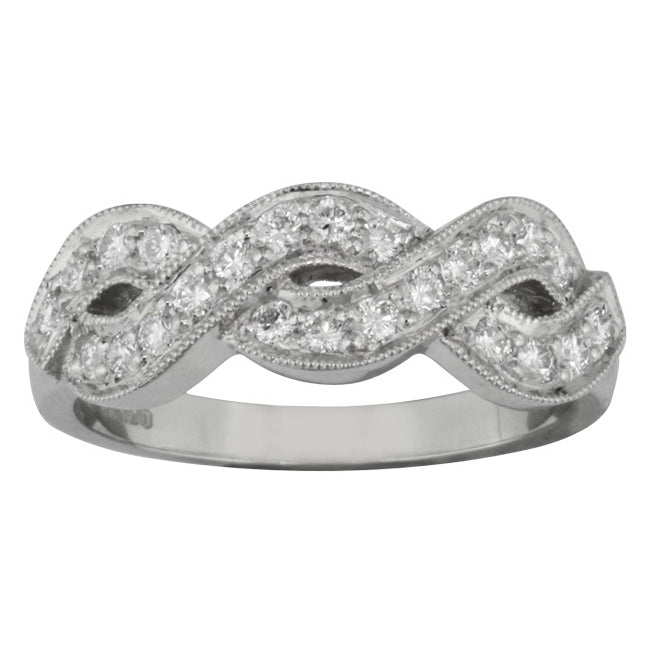 This cross over diamond ring in 18 carat white gold features a double band of round diamonds, all set in white gold.