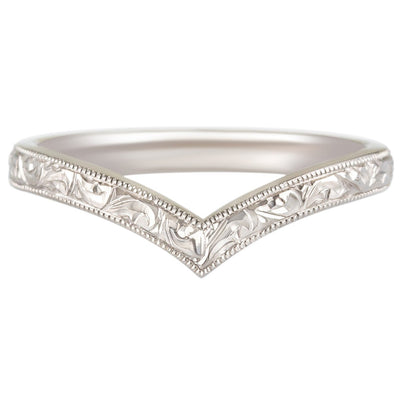 Expertly crafted in 18ct white gold, this unique 2.5mm scroll engraved V-shaped wedding ring is a timeless and durable piece to complement your engagement ring.