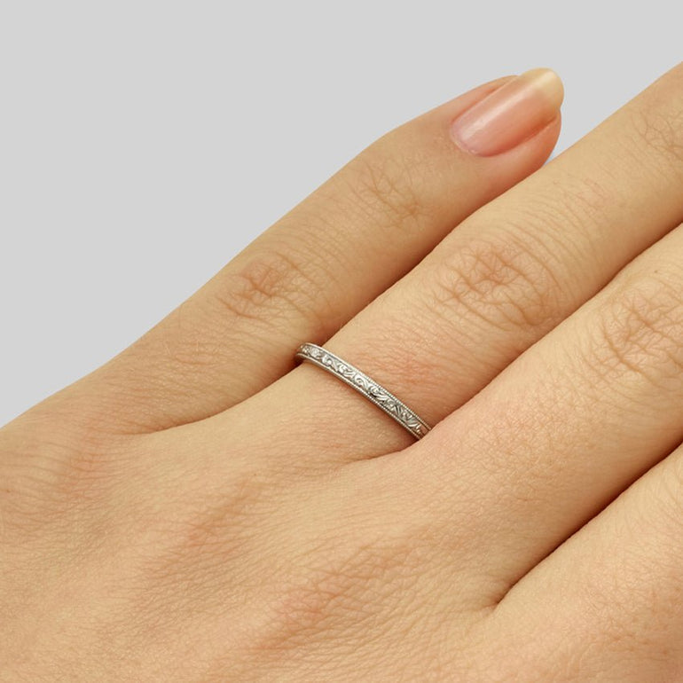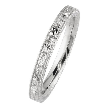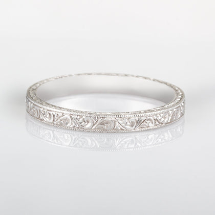 This hand engraved wedding ring is 2mm wide and made in 18ct white gold. The vintage style scroll pattern is edged with small white gold millegrain beads.