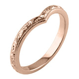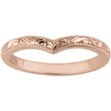 This engraved wishbone wedding ring is made in 18ct rose gold. The 2mm wide band is edged with millegrain.