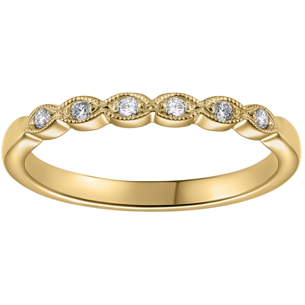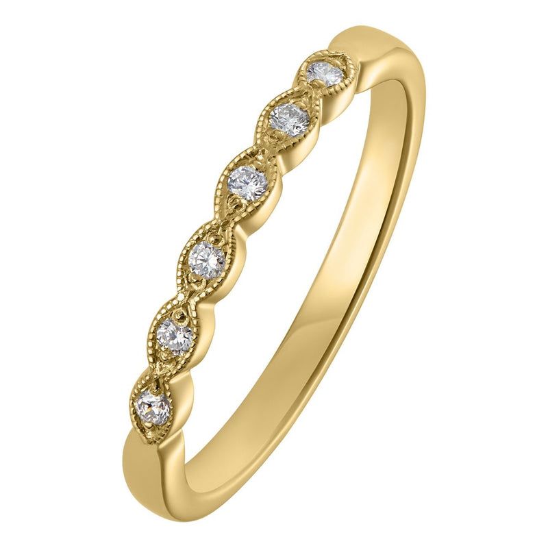 This 18 carat yellow gold diamond wedding band is designed with a distinctive scalloped profile that elegantly contours around the finger. The six round brilliant-cut diamonds are carefully placed within each scallop, with fine millegrain edging framing their sparkle.