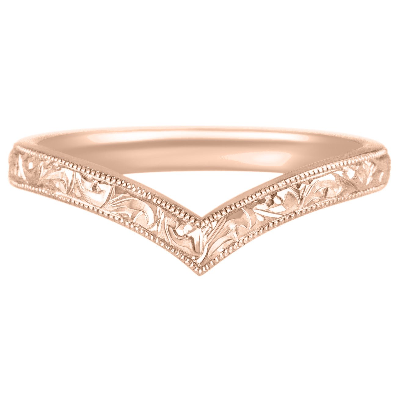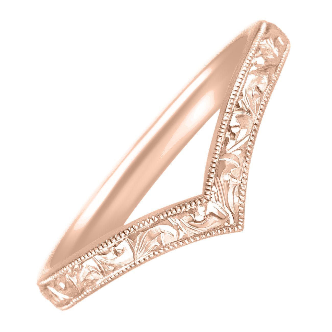 Rose gold v-shape wishbone wedding band with scroll pattern engraving
