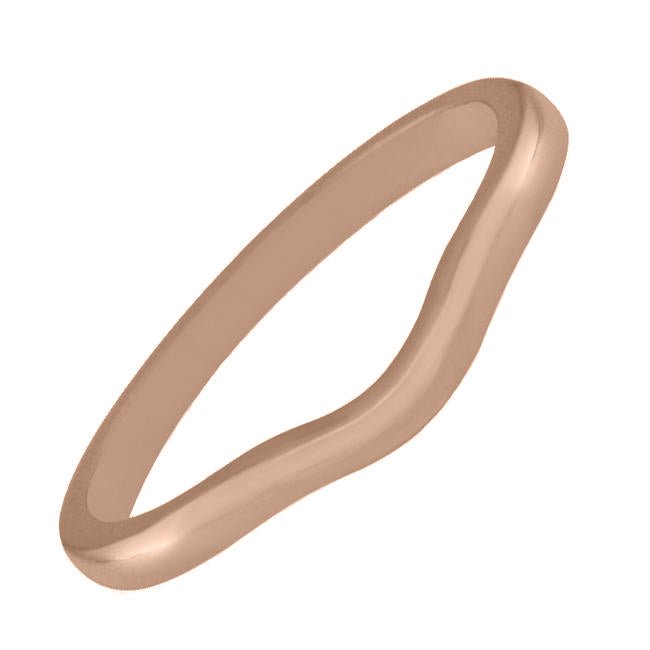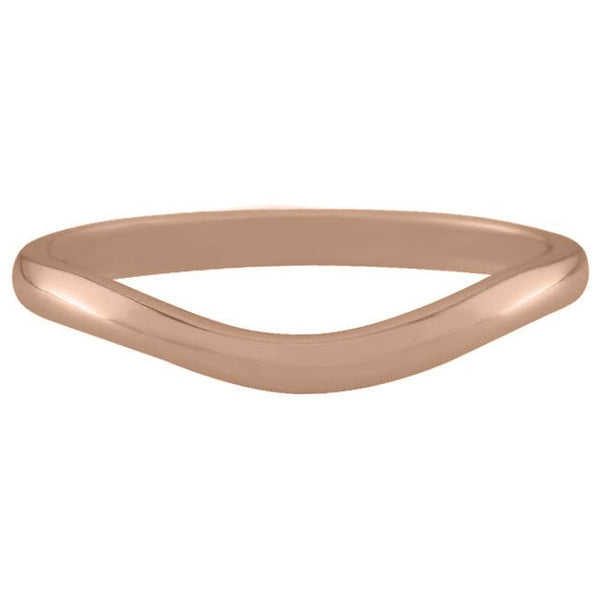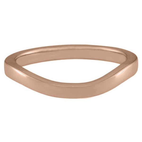This shaped wedding ring in 18ct rose gold is designed to gently curve around the gemstone in your engagement ring. The D-shape band has a width of 2.00 mm.