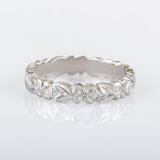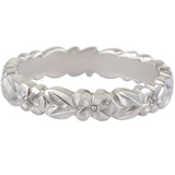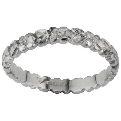This unusual flower wedding band features a delicate forget-me-not naturalistic pattern engraved by our expert craftsmen in Hatton Garden, London. The 18ct white gold engraved wedding band has 3.5mm width and court profile.