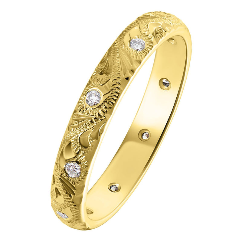 3mm hand engraved diamond wedding band in yellow gold with paisley pattern