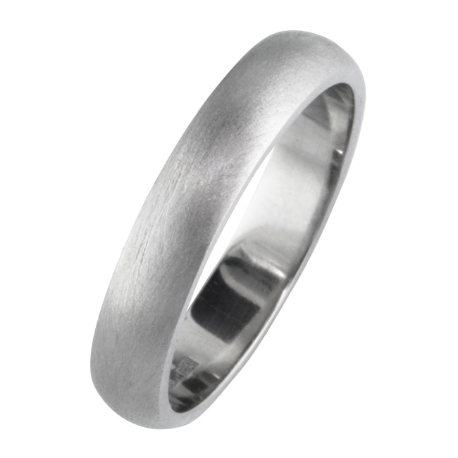This platinum ring is 4mm wide with a brushed satin finish. The matt D-shape band is flat inside with a rounded outside profile.