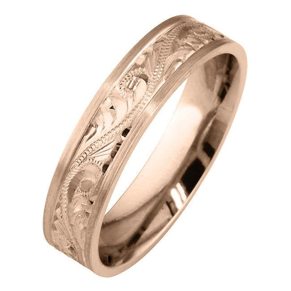 This unique hand-engraved wedding ring with a forget-me-not floral pattern is 5mm wide in a flat court shape. The 18ct rose gold man's and woman's wedding ring is edged with millegrain (milgrain) on either side to complete the vintage style design.