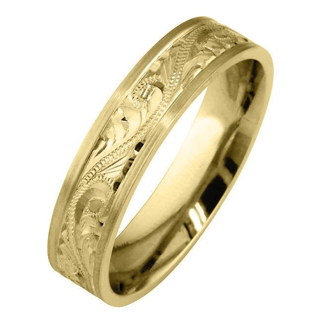 This hand-engraved paisley pattern wedding ring is made in 18ct yellow gold. The 5mm band has contrasting polished edges that highlight the unique pattern. All ring sizes are available.