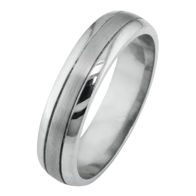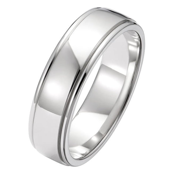 This men's platinum wedding ring has two ridges with a satin finish inner band and two outer polished bands. This D-shaped band is available in all rings sizes.