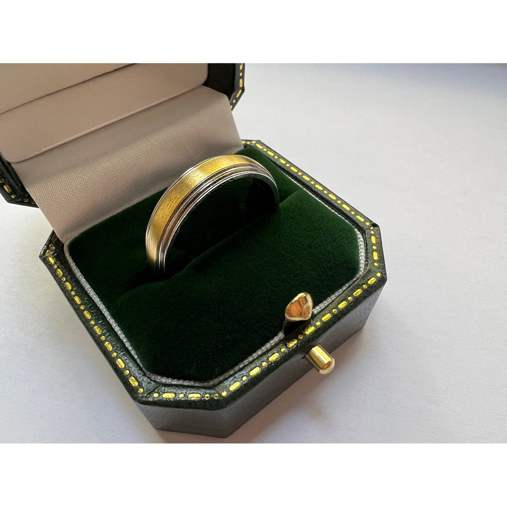 A 5mm wide men's wedding ring with a brushed yellow gold centre and platinum on the edges and inside. The round platinum edges of the court band have two polished grooves. This heavy-weight ring has a wall depth of 2.10mm.