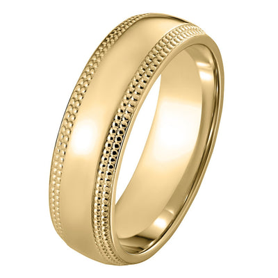 This men's brushed wedding band has a double millegrain pattern on both edges. The heavy 6mm band has a court profile, with a domed curve outside of the ring. The gently rounded interior provides a comfortable fit on your finger.