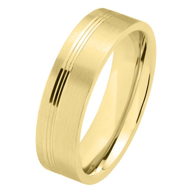 This 6mm decorative satin finish 18ct yellow gold wedding ring features three contrasting polished grooves. The grooves are placed off-centre.