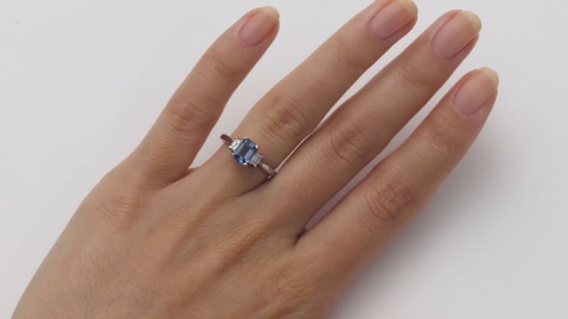 This trilogy ring features an emerald-cut aquamarine set between two emerald-cut diamonds. The lovely blue colour and unusual design will attract many favourable comments for the person wearing this ring.