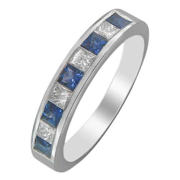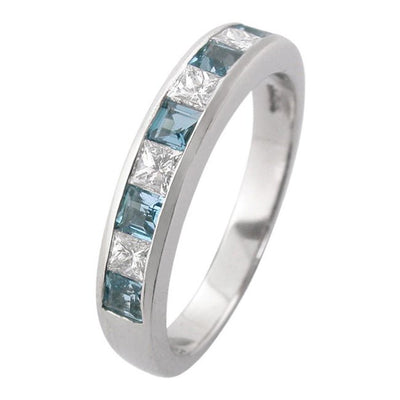 This aquamarine and diamond ring makes an unusual half eternity ring or wedding ring. Five clear blue aquamarines alternate with four princess cut diamonds in a platinum band setting.