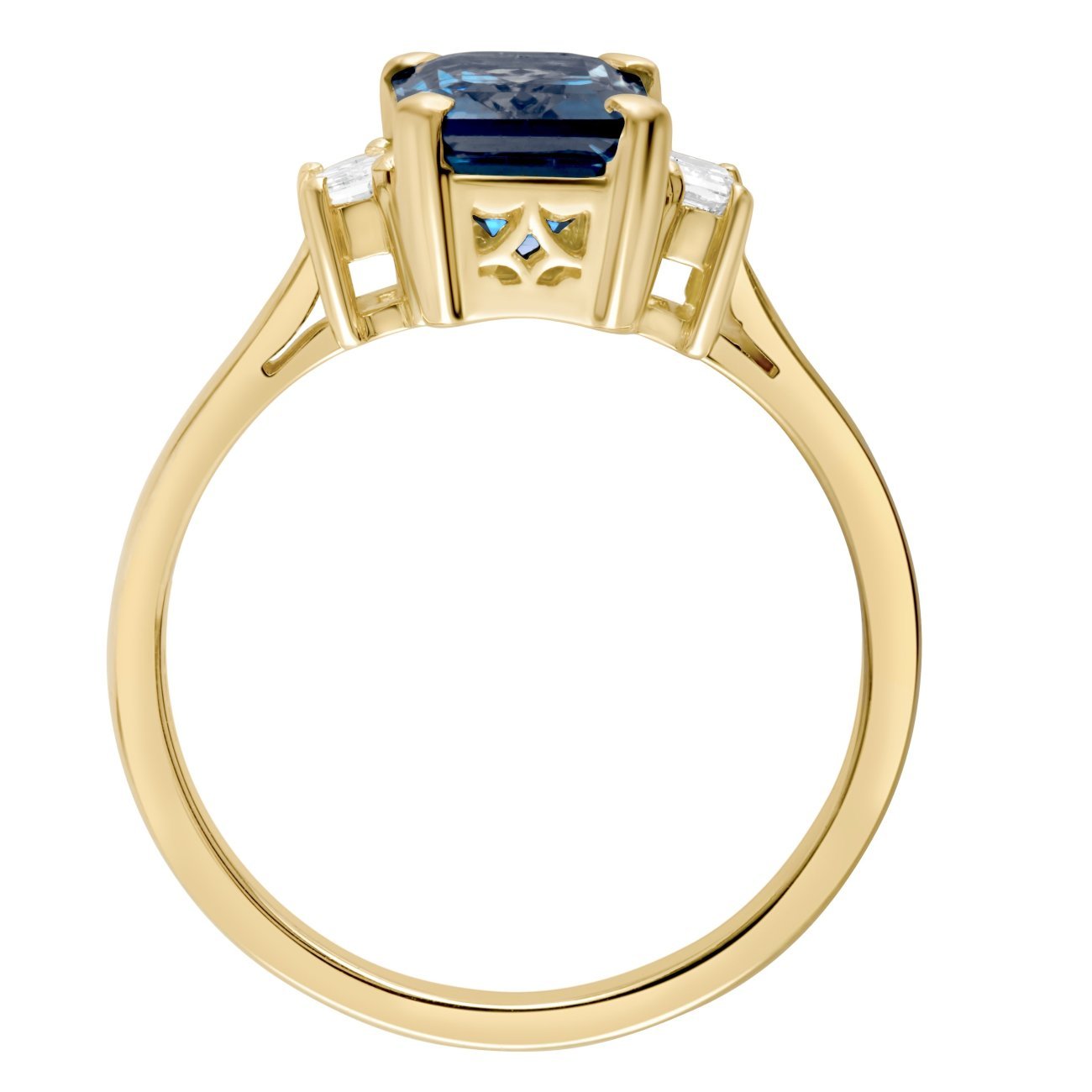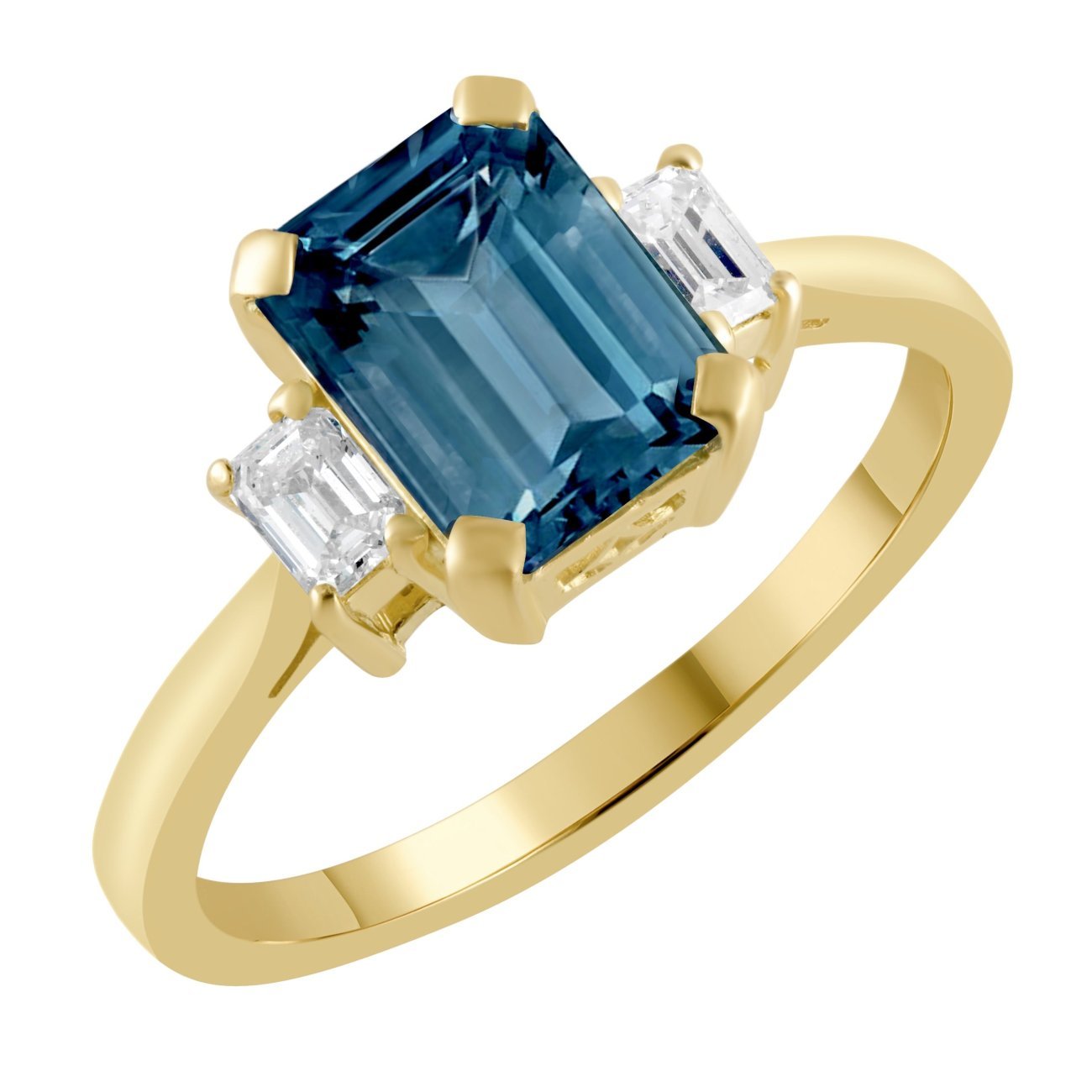 Our aquamarine and diamond trilogy ring features an emerald-cut light blue aquamarine in the centre, with an emerald-cut diamond on either side.