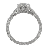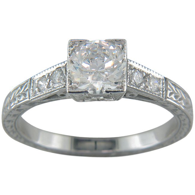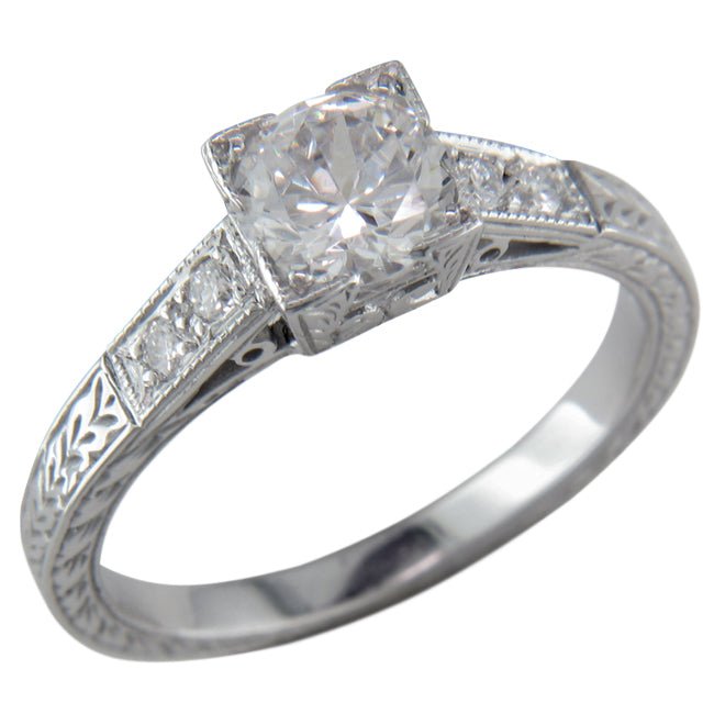 This Art Deco style engraved ring is an exact design of an original vintage ring. The ring features a round GIA graded diamond held in an unusual square engraved collet, leading to a platinum band set with diamonds. The band is hand-engraved on three sides to give the ring a distinctive look.