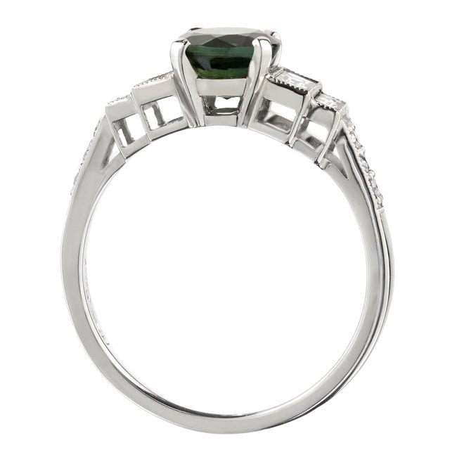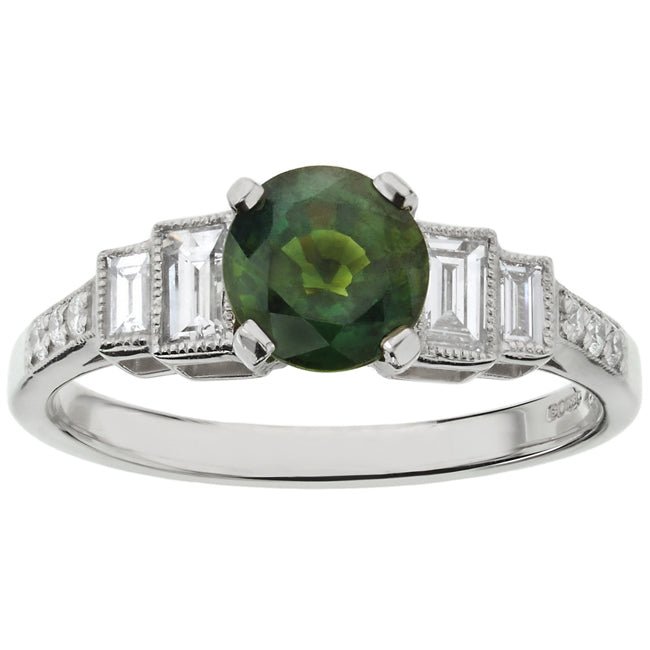 This unusual green sapphire and diamond ring is made in the Art Deco style. The round green sapphire is held in a four-claw setting.