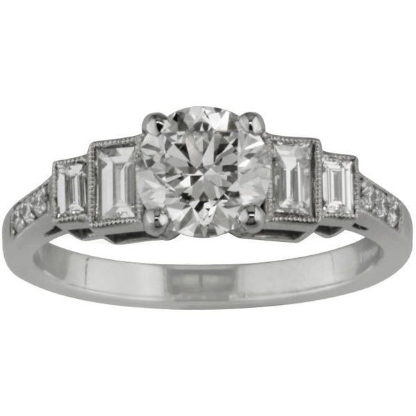 The band of the platinum ring features both baguette and round diamonds, with the diamonds edged in vintage style platinum grains or millegrain. The diamonds weigh a total of 0.37 carat.