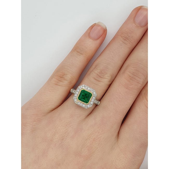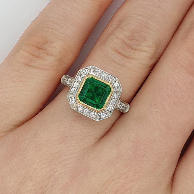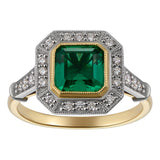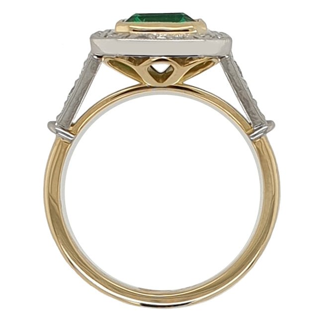 The two-tone ring has the emerald set in 18ct yellow gold, with the diamonds in the halo and shoulders set in high-quality platinum 950. The D-shape band is in 18ct yellow gold.