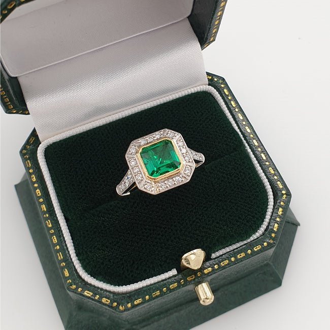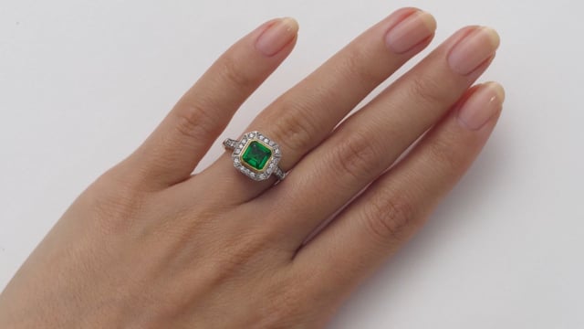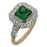 This Art Deco style emerald and diamond cluster ring features an impressive octagonal emerald surrounded by a halo of diamonds.