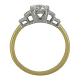 Like many rings from this era, the small details make for an interesting piece. Please view the side image to see the heart motif on either side of the central collet holding of the main diamond. The shoulders are each set with two diamonds in a step arrangement and the steps are millegrain edged.
