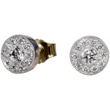 Diamonds weighing half a carat are set in this pair of elegant diamond cluster earrings. The earrings are made in both white gold and yellow gold, with the diamonds set in white gold to highlight the white of the gemstones. Millegrain beading gives the earrings a timeless and classic look. Please contact us to view the earrings in person or order online.