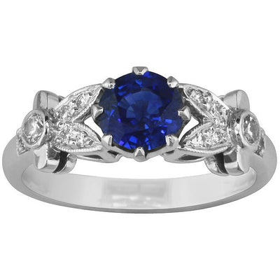 A lovely blue 1.00 carat sapphire is set in this antique style platinum ring. Two diamond-set stylized leaves lead to the sapphire. A total of 12 diamonds cascade down the leaves to the band.