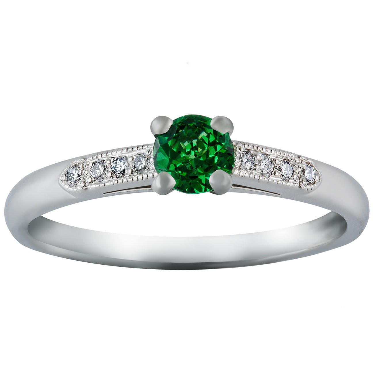 This unique engagement ring contains a round tsavorite in the centre, held securely with four claws. Three diamonds on each shoulder lead to another diamond, in a heart motif. The diamonds are set in the platinum band with a delicate millegrain beading, creating an elegant Edwardian-inspired look.