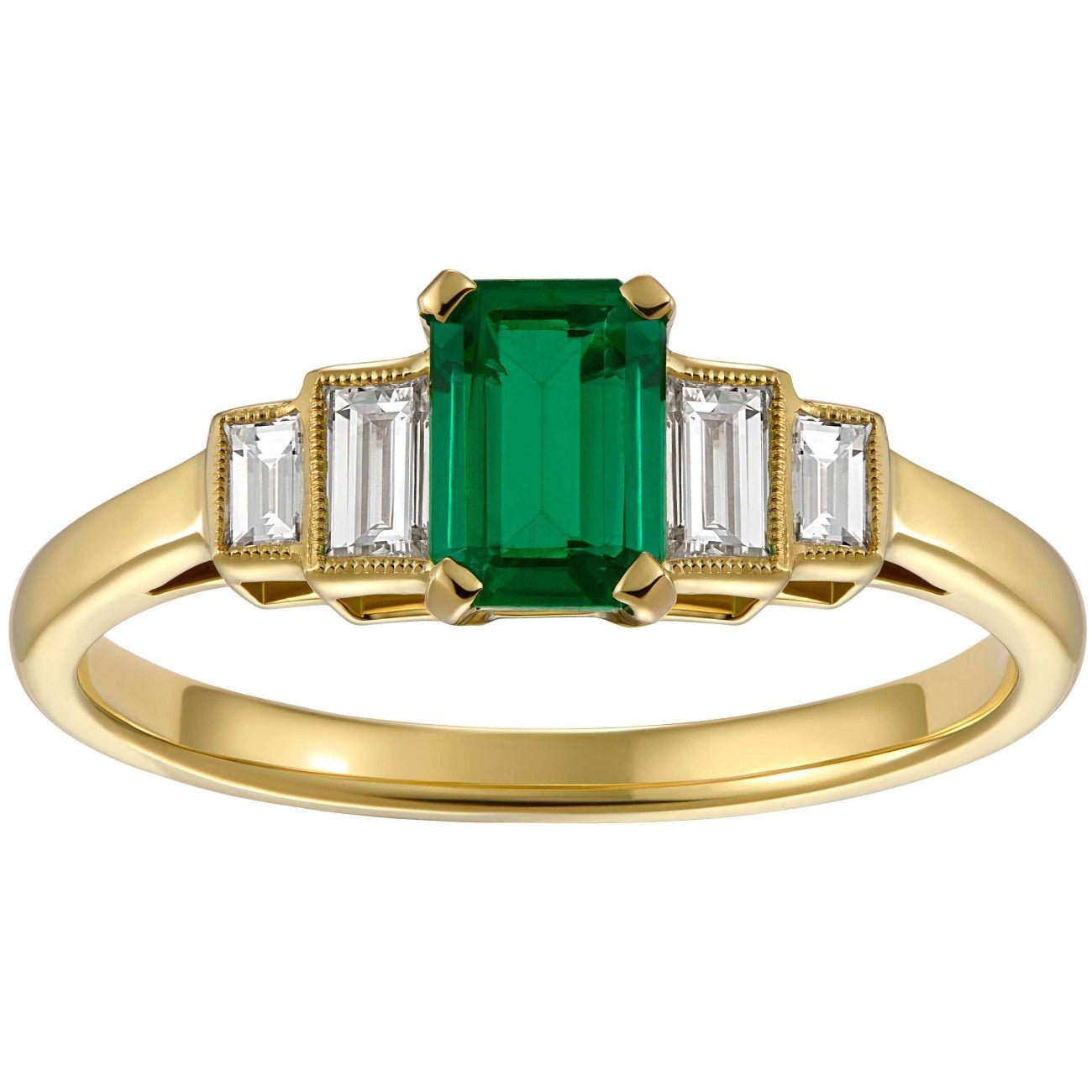 This five-stone ring features a central emerald with baguette diamonds set in an 18 carat yellow gold band. Inspired by the Art Deco era, this emerald ring has a fine millegrain beading in keeping with the vintage style.