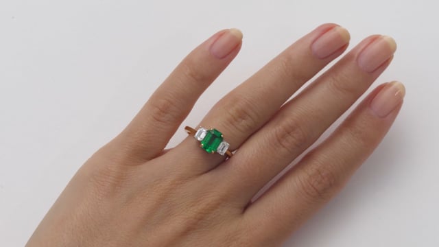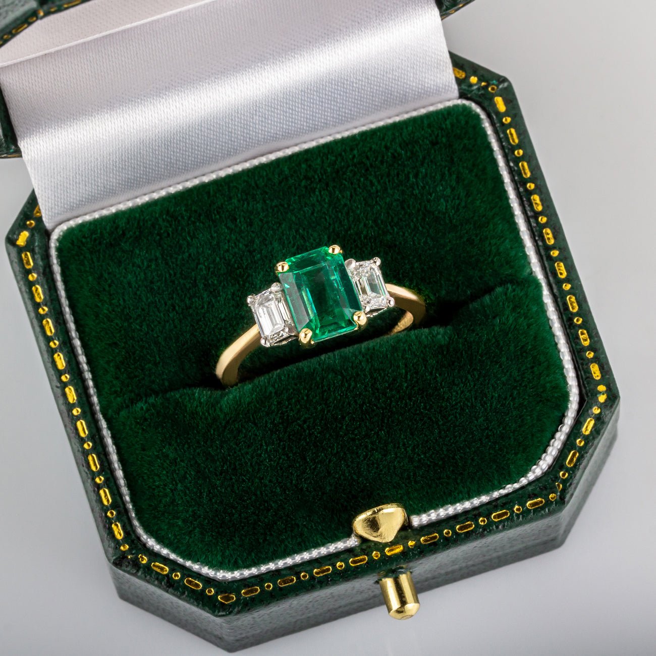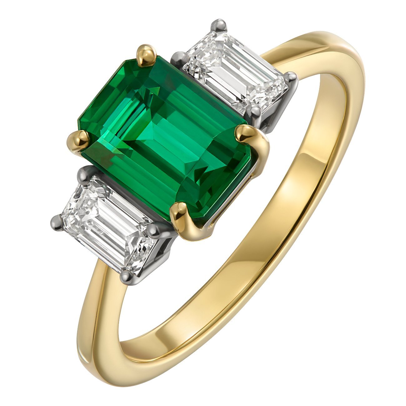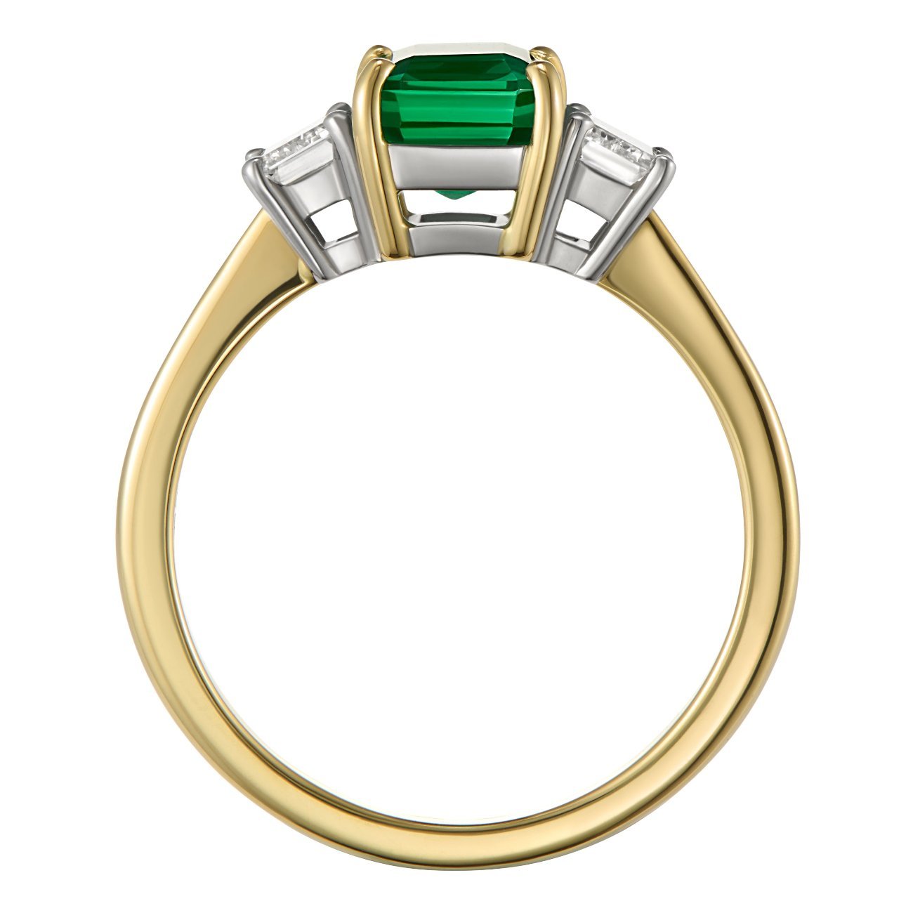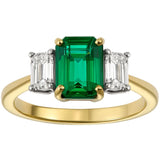 This elegant Art Deco style three stone ring features an outstanding quality emerald flanked by emerald-cut diamonds. The two diamonds are set in platinum to emphasise the white of the gemstones, while 18ct yellow gold was chosen to hold the emerald and create the band.