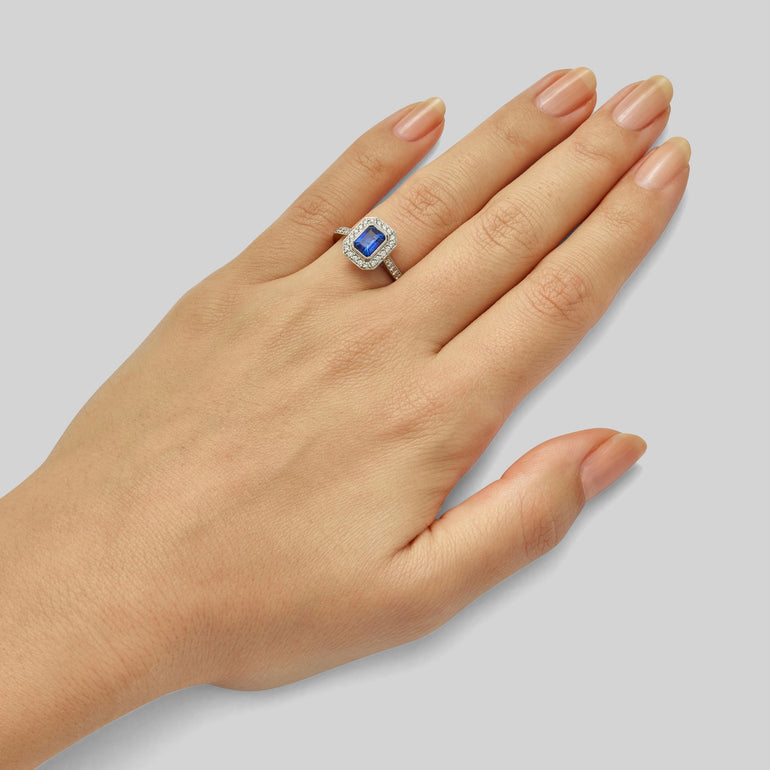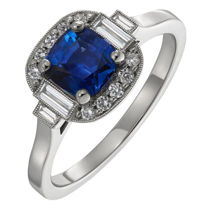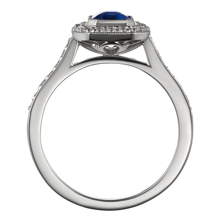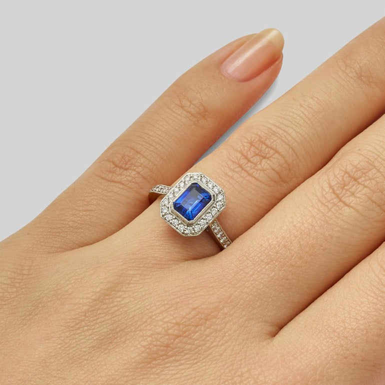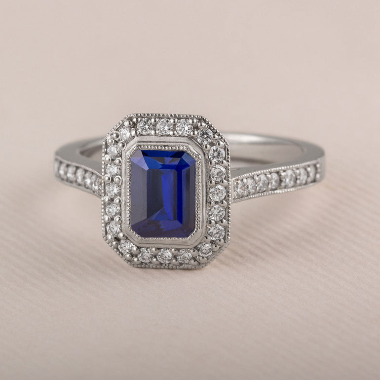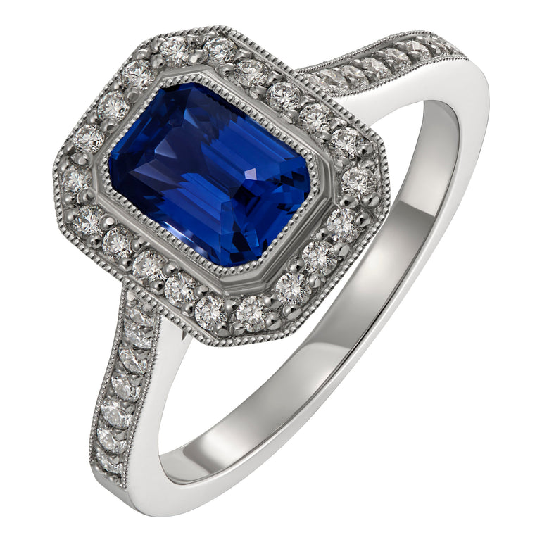 This octagonal-shape cluster ring in platinum is set with a blue sapphire. The emerald cut sapphire is surrounded by 20 round brilliant cut diamonds, with a further seven diamonds cascading along each side of the band. The diamonds are set with shared grains and finished with vintage style millegrain edges.