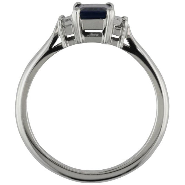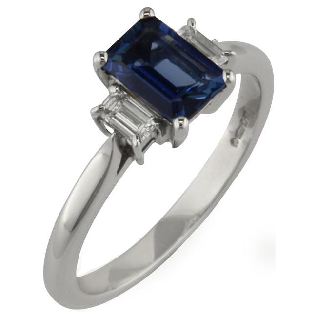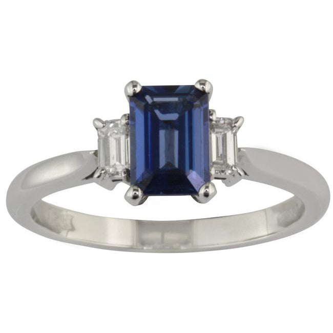 A lovely fine quality blue sapphire is set between two emerald cut diamonds in this platinum three stone engagement ring.
