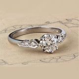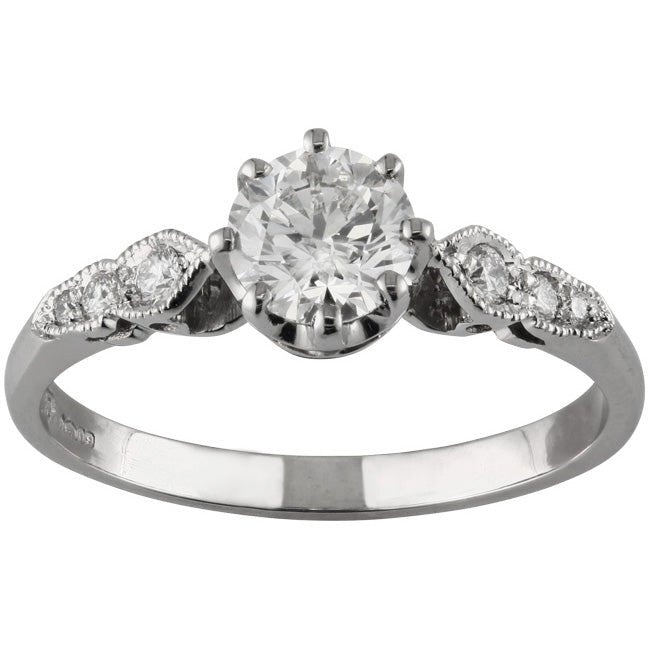 This Edwardian style engagement ring features a GIA graded round diamond. The shaped diamond band is set with six round diamonds. The side diamonds are edged with millegrain in the vintage style.