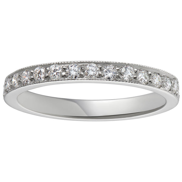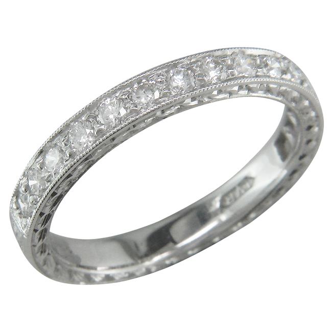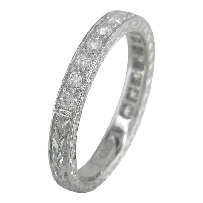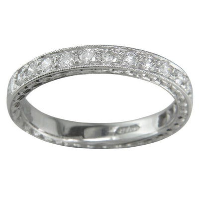 A vintage style engraved diamond wedding ring with 15 round diamonds in 18 carat white gold. The 2.5mm width ring can be worn as a matching set with both modern and vintage style engagement ring. Each ring is engraved by hand for your ring size.