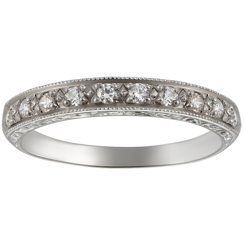 This 3mm hand-engraved platinum and diamond wedding ring is expertly made in the UK and features a fine vintage-style scroll pattern, as well as millegrain edges that enclose the 10 round diamonds.