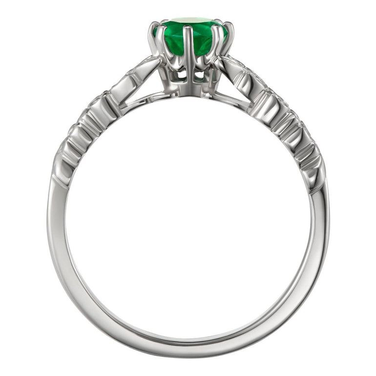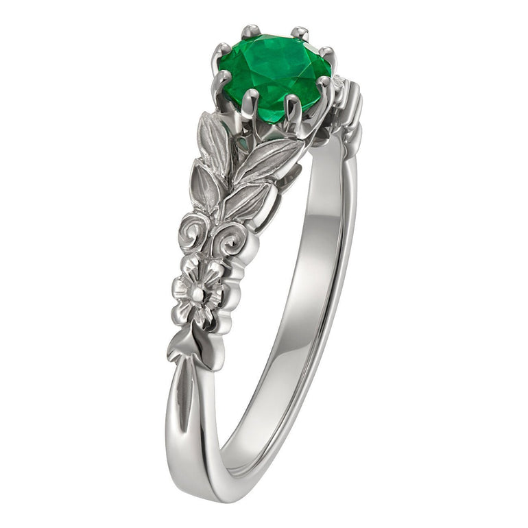 This unique emerald engagement ring is engraved with flowers, leaves and decorative scrolls. The platinum ring is set with a beautiful 0.55 carat round emerald.
