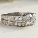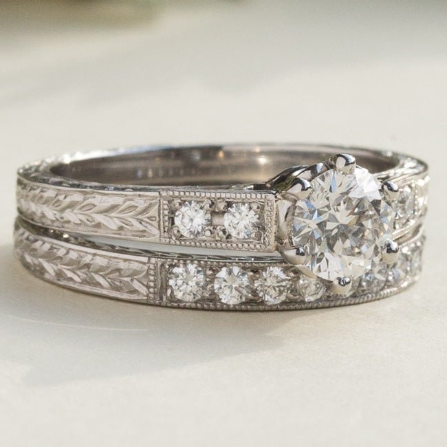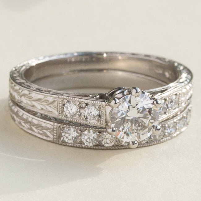 Hand engraved bridal set with diamond engagement ring