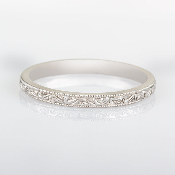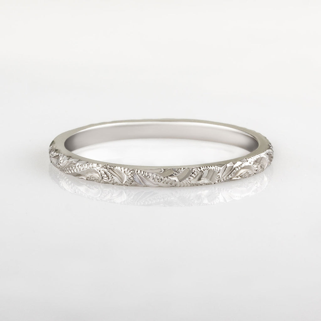 The 2mm hand engraved paisley pattern wedding ring in platinum has a delicate and pretty design. The slim engraved band sits nicely with both traditional and antique engagement rings and is perfect for brides looking for something different for their wedding ring.