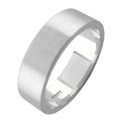 This flat court wedding ring in platinum is 6mm wide and has a modern brushed finish.