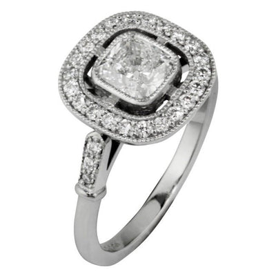 This bespoke ring has a halo of round diamonds surrounding the cushion cut diamond. Art Deco style shoulders with diamond accents complete the look. The ring is made in platinum and features millegrain edging in keeping with the vintage influenced design.