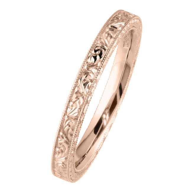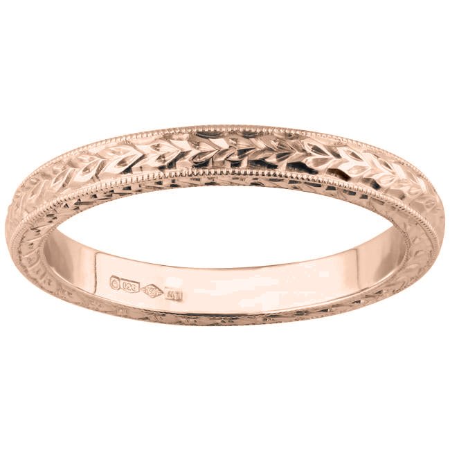 This 18ct rose gold wedding ring is hand engraved with a circle of laurel leaves and edged with millegrain. The 2.20 mm wide court band makes a lovely fit with many vintage style engagement rings.