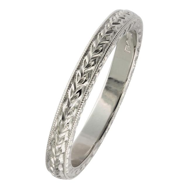 This wedding ring is hand engraved with a circle of laurel leaves and edged with millegrain. The 2.20 mm wide court band makes a lovely fit with many vintage style engagement rings.