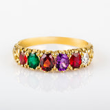 This sentimental love token ring spells the word Regard using the initial letters of the following gemstones: Ruby, Emerald, Garnet, Amethyst, Ruby, and Diamond. The 18ct yellow gold mount has carved and scrolled shoulders, typical of the late Victorian era.
