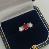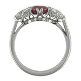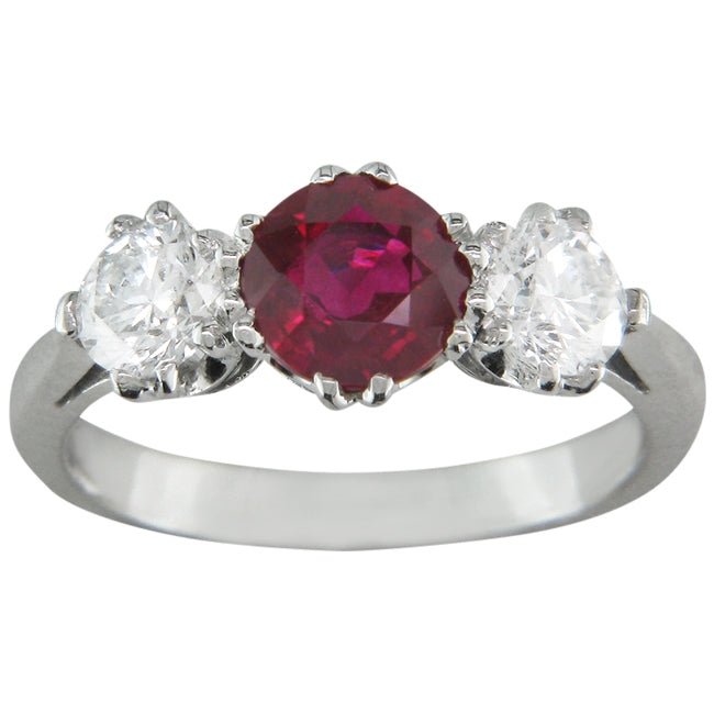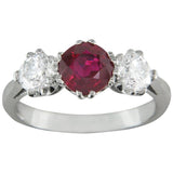 A ruby and diamond trilogy engagement ring has a central ruby weighing 0.81 carat. The ruby is set in an double prong platinum setting and framed either side by a round brilliant cut diamond that balance perfectly with the deep red central gemstone. This ring setting is a low set and practical design for everyday wear.