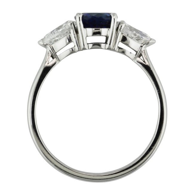 A sapphire and diamond ring featuring a round blue sapphire with pear-shaped diamonds on either side. The combination of the gemstones gives rise to a modified elliptical shape, or elongated oval. This is a geometric shape used during the Art Deco era of the 1920s and 1930s.