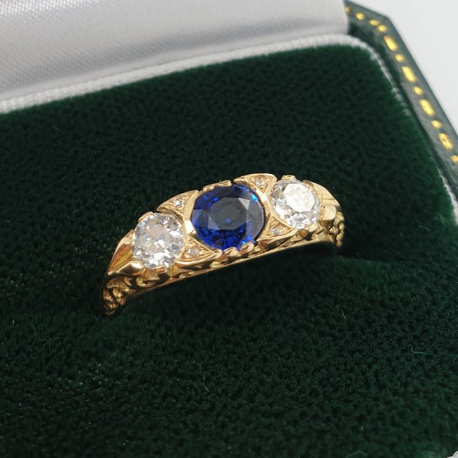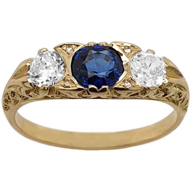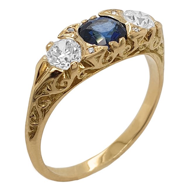This sapphire and diamond ring is set with a centre blue sapphire with an old-cut diamond on either side. The 18ct yellow gold ring has four diamond points set between the sapphire and larger diamonds.